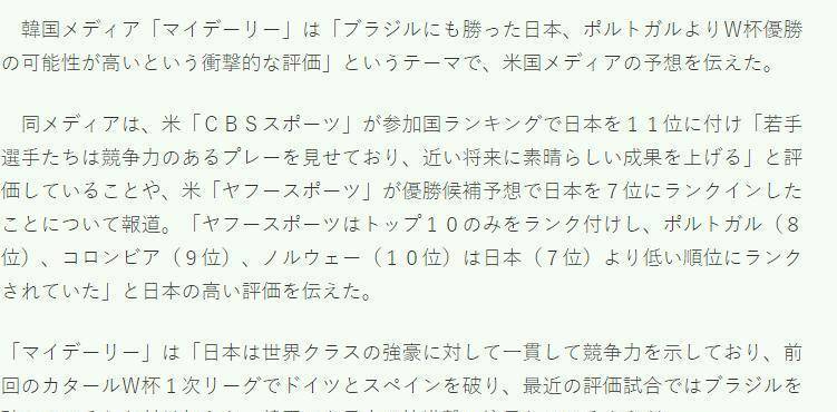 另一家媒体CBS体育也将日本排在第11位,理由是日本队拥有“持续进步的三十年国家计划”。