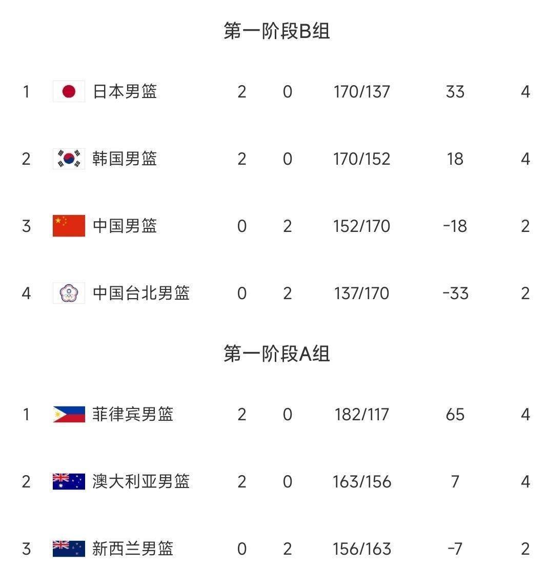 B组积分榜上,日本和韩国同以2胜0负领跑,中国队与中国台北队均为0胜2负,仅以净负分优势排名第三。根据赛制,小组前三名晋级第二阶段,且第一阶段成绩将带入第二阶段,这使得中国队的连败影响深远。