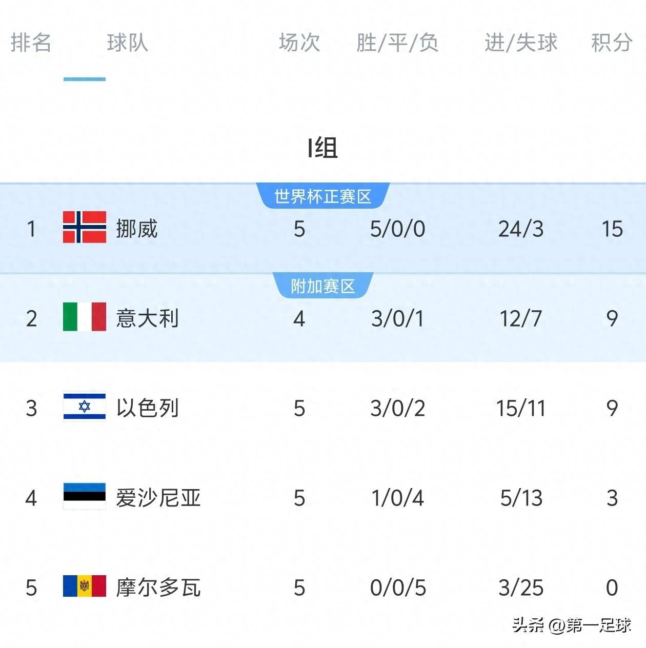 在竞争激烈的I组,挪威队以全胜战绩积15分,傲视群雄,更令人咋舌的是,他们还拥有高达21个的净胜球优势。意大利队目前积9分,少赛一场,位居次席。接下来的赛程对两队至关重要:
