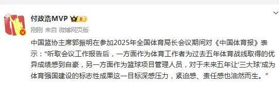 体育投注,体育投注平台,体育投注app,体育赛事,世界杯,奥运会,NBA,实时比分,体育新闻,欧洲杯,英超赛程,西甲赛程北京时间12月29日,在参加2025年全国体育局长会议期间,中国篮球协会主席郭振明发表重要讲话。他表示,聆听完会议工作报告后,内心既充满自豪,也深感压力与责任。一方面,作为一名体育工作者,他为过去五年整个体育战线所取得的优异成绩感到骄傲;另一方面,作为篮球项目的管理者,他对未来五年实现让足球、篮球、排球“三大球”成为体育强国建设的标志性成果这一重任深感紧迫和艰巨。郭振明强调,这不仅是一个目标,更是一份沉甸甸的责任,必须全力以赴应对挑战。