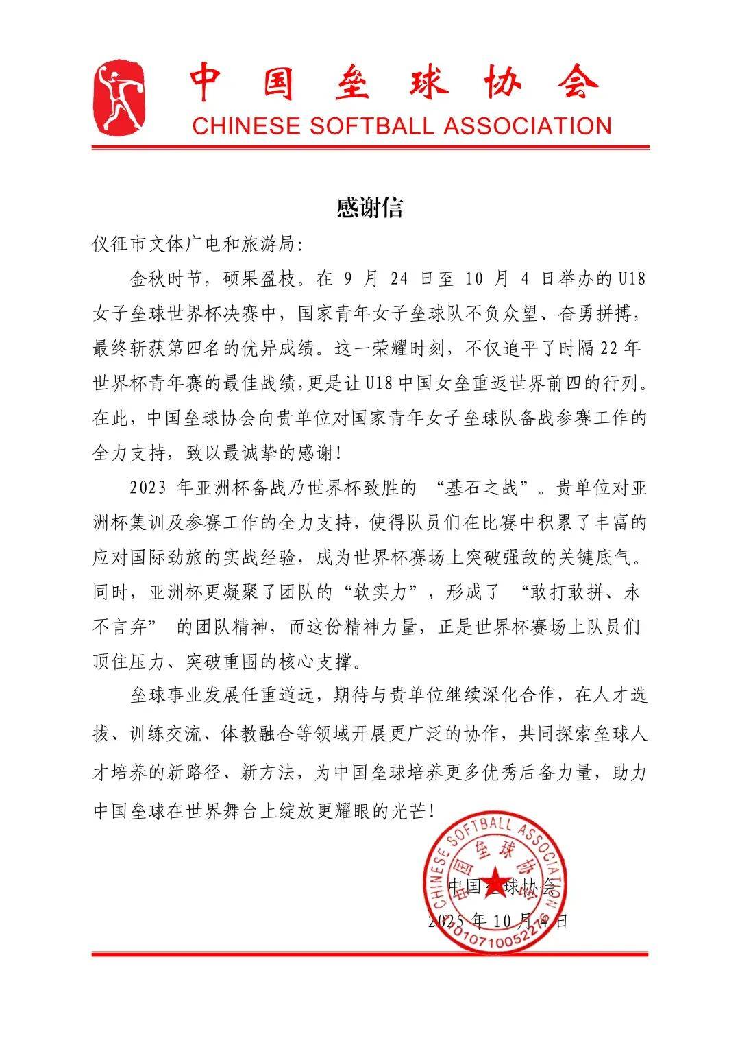 10月10日,仪征市文体广电和旅游局收到了一封来自中国垒球协会的感谢信。原来,在4日结束的U18女子垒球世界杯决赛中,国家青年女子垒球队斩获第四名,追平了时隔22年的世界杯青年赛的最佳战绩。国家青年女子垒球队2023年正是在仪征市树旗,并在仪征市集训了67天,备战当年的亚洲杯比赛。