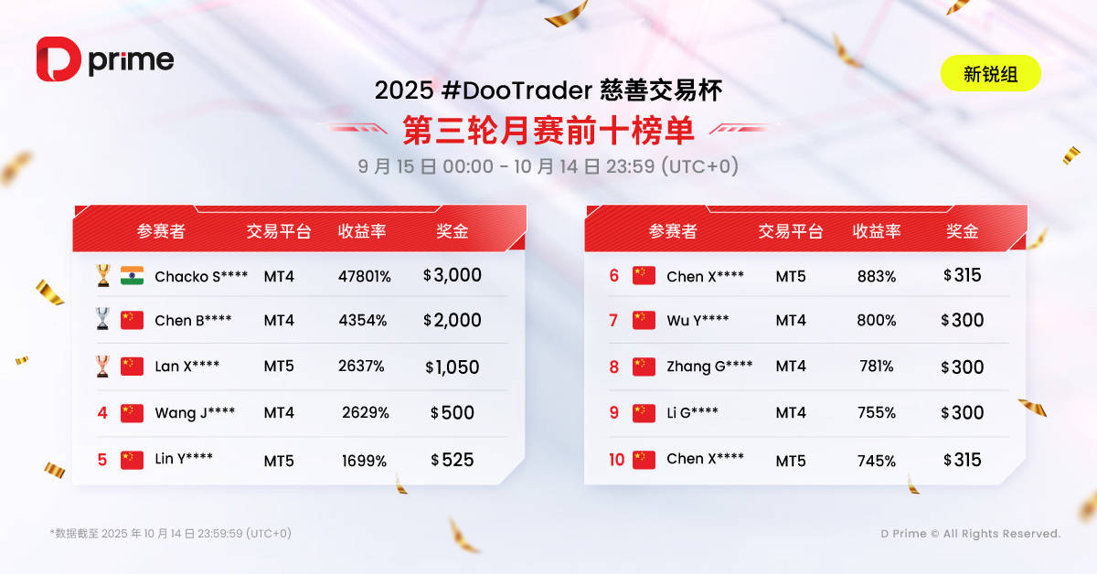 500)this.width=500 align=center hspace=10 vspace=10 rel=nofollow/2025 年 D Prime #DooTrader 慈善交易杯第三轮月赛已于 10 月 14 日 23:59(UTC+0)顺利收官,最新榜单已火热出炉!第四轮月赛紧随于 2025 年 10 月 15 日 00:00(UTC+0)开赛 —— 欢迎各路交易高手立刻报名,争夺岛屿巅峰赛线 日第三轮月赛开赛以来,在美联储降息如期落地﹑美国政府停摆延续,美元持续走弱等因素共振下,现货黄金自 3,700 美元关口一路刷新歷史高位至 4,200 美元,成为全球市场焦点。在行情持续上行的走势下,第三轮月赛更彰显参赛者对市场的敏锐判断力与乘势出击的执行果断力。接下来,就让我们一同回顾本轮比赛的精彩瞬间,见证中﹑印 、日、韩四国高手的巅峰对决。